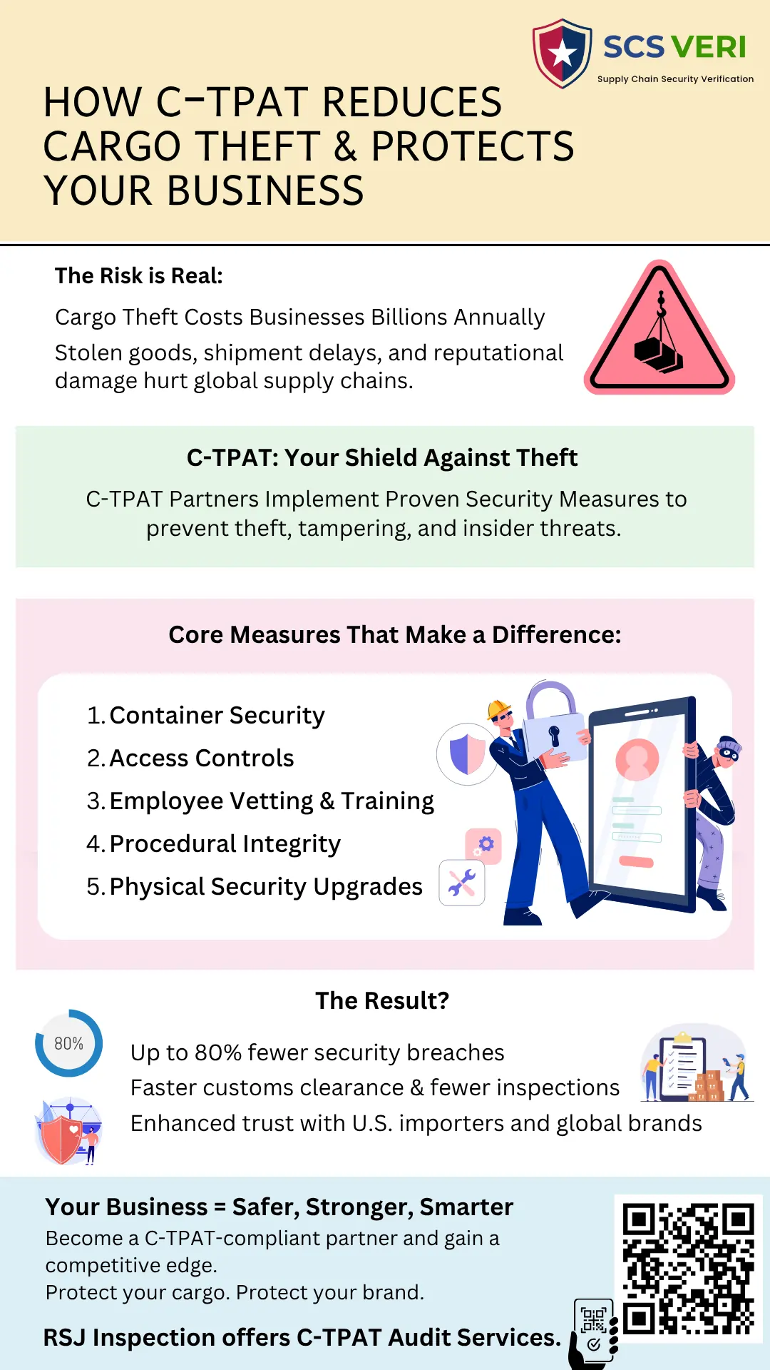 At RSJ Inspection, our mission goes beyond compliance—we help businesses build resilient, transparent, and trustworthy supply chains. Through independent audits and expert-led training, we enable organizations to not only meet CTPAT requirements but also strengthen long-term global trade partnerships.