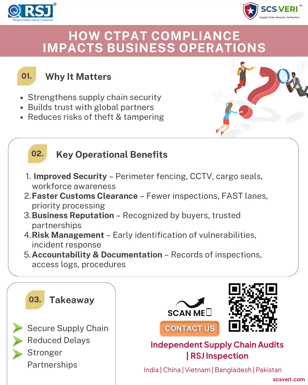 At RSJ Inspection, our mission goes beyond compliance—we help businesses build resilient, transparent, and trustworthy supply chains. Through independent audits and expert-led training, we enable organizations to not only meet CTPAT requirements but also strengthen long-term global trade partnerships.